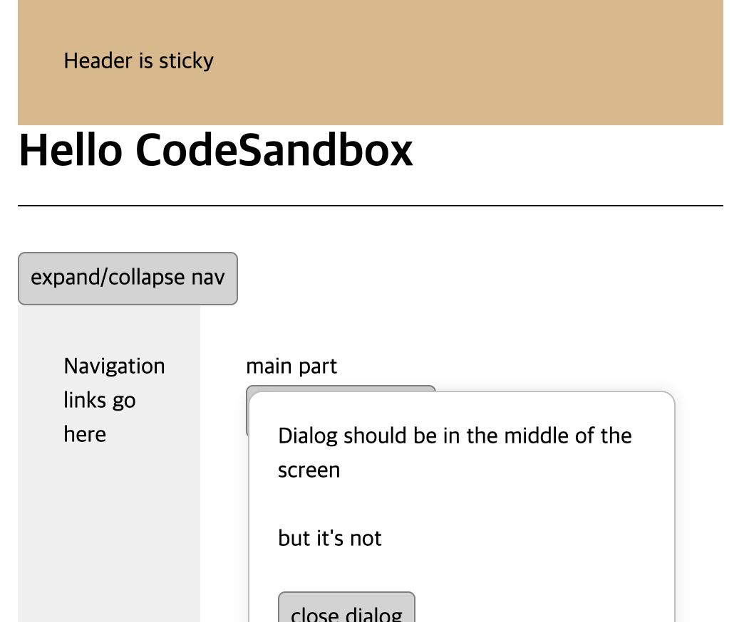 위 코드에서 header는 sticky에 z-index를 높여주면 원하는대로 상단에 고정되도록 구현할 수 있다. 하지만 모달이 main안에서 context가 존재하기 때문에 sidebar에 움직임에 따라서 shift가 발생할 뿐만 아니라 header에 가려지게된다. 이러한 문제를 해결하기 위해서 모달은